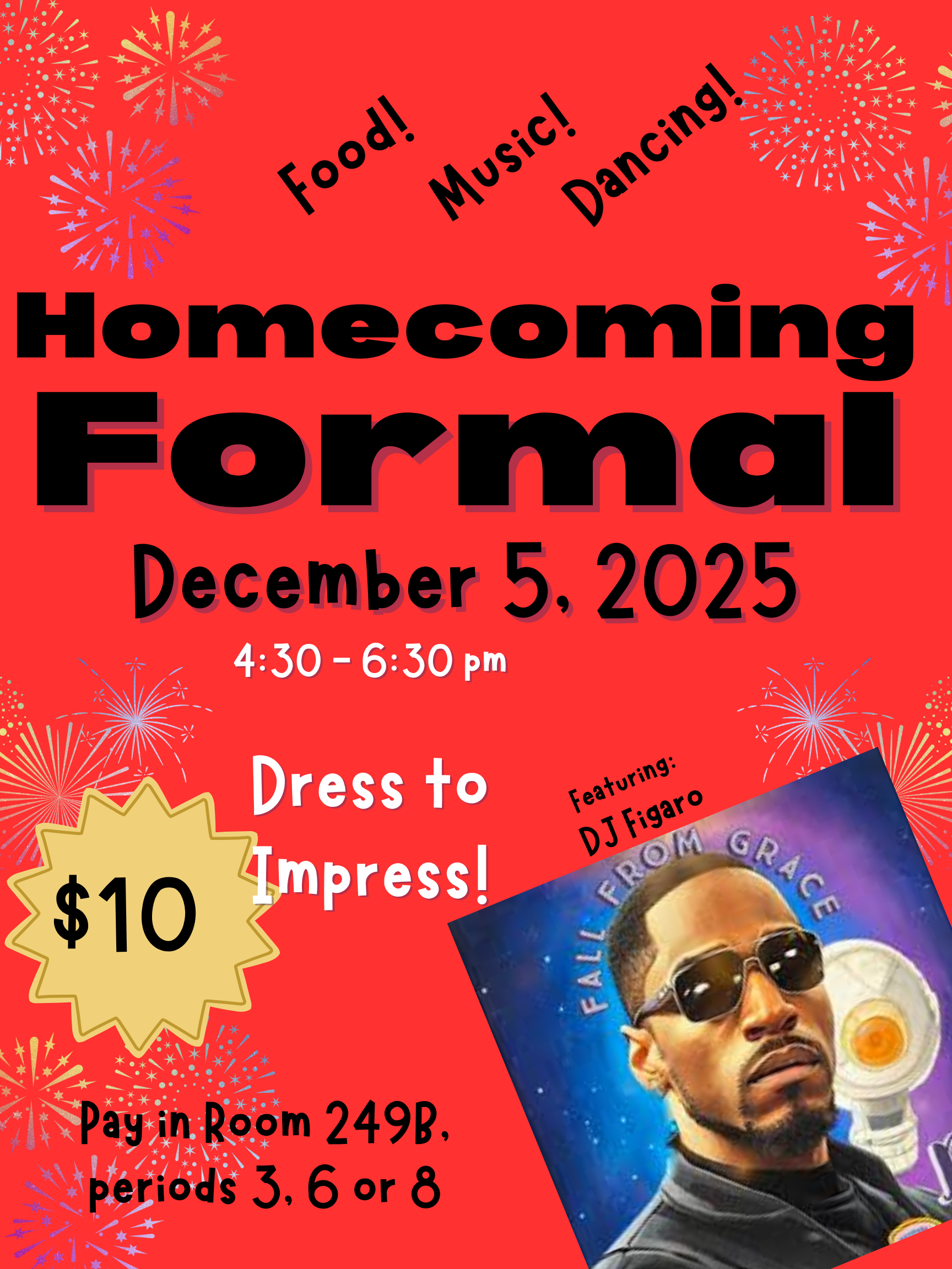 Homecoming Formal Food! Music! Dancing! The Newtown Homecoming Formal Dress to Impress! Featuring DJ Figaro! December 5th, 2025 4:30 PM - 6:30 PM $10 admission Pay in room 249B periods 3, 6, or 8 Published November 19, 2025 Print
