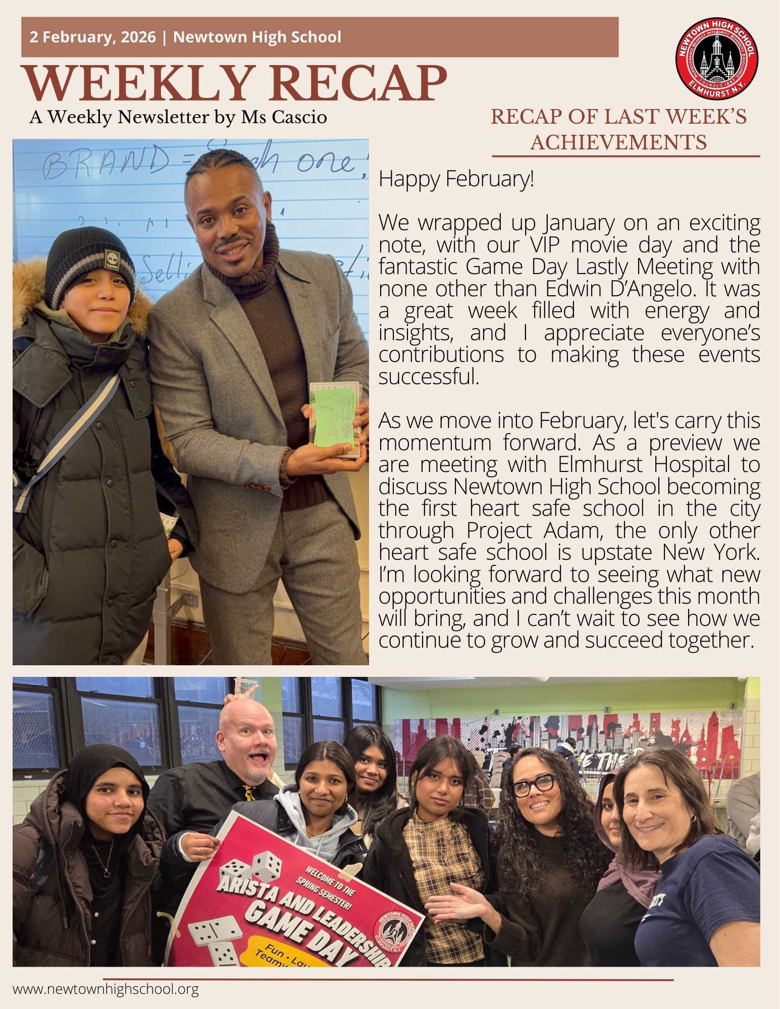 As we move into February, let's carry this momentum forward. As a preview we are meeting with Elmhurst Hospital to discuss Newtown High School becoming the first heart safe school in the city through Project Adam, the only other heart safe school is upstate New York. I’m looking forward to seeing what new opportunities and challenges this month will bring, and I can’t wait to see how we continue to grow and succeed together.