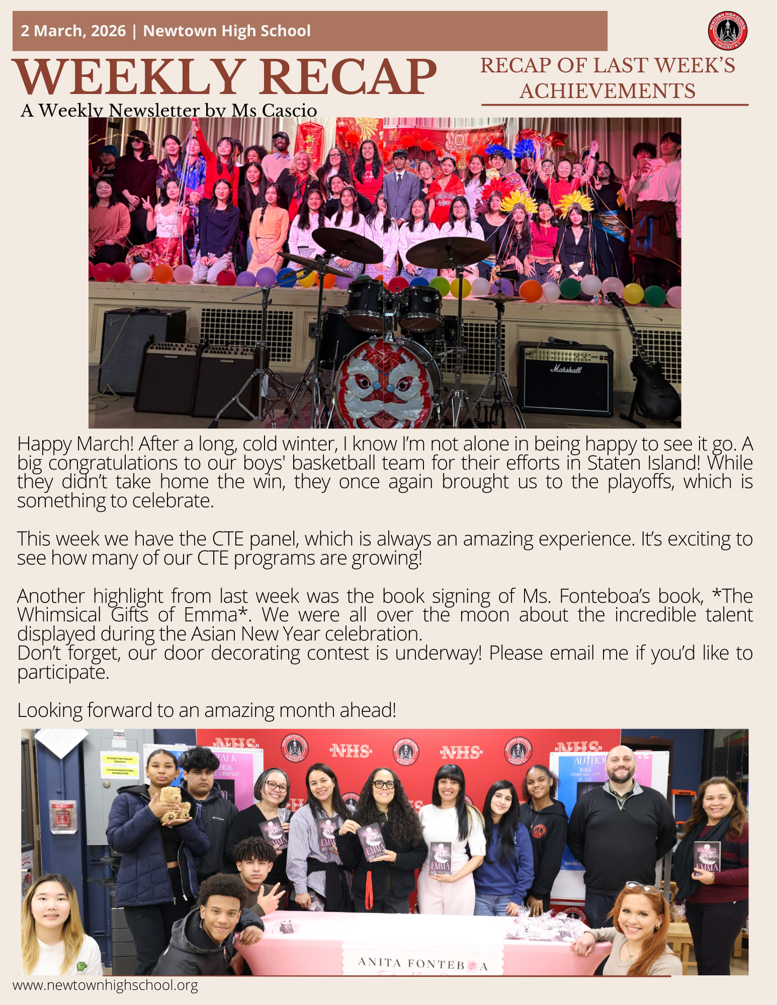 Happy March! After a long, cold winter, I know I’m not alone in being happy to see it go. A big congratulations to our boys' basketball team for their efforts in Staten Island! While they didn’t take home the win, they once again brought us to the playoffs, which is something to celebrate.