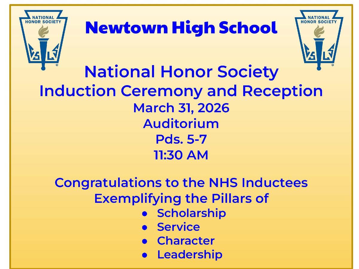 On March 31st, 2026 in the auditorium periods 5-7 (11:30 AM), Newtown will host the National Honor Society Induction Ceremony and Reception!