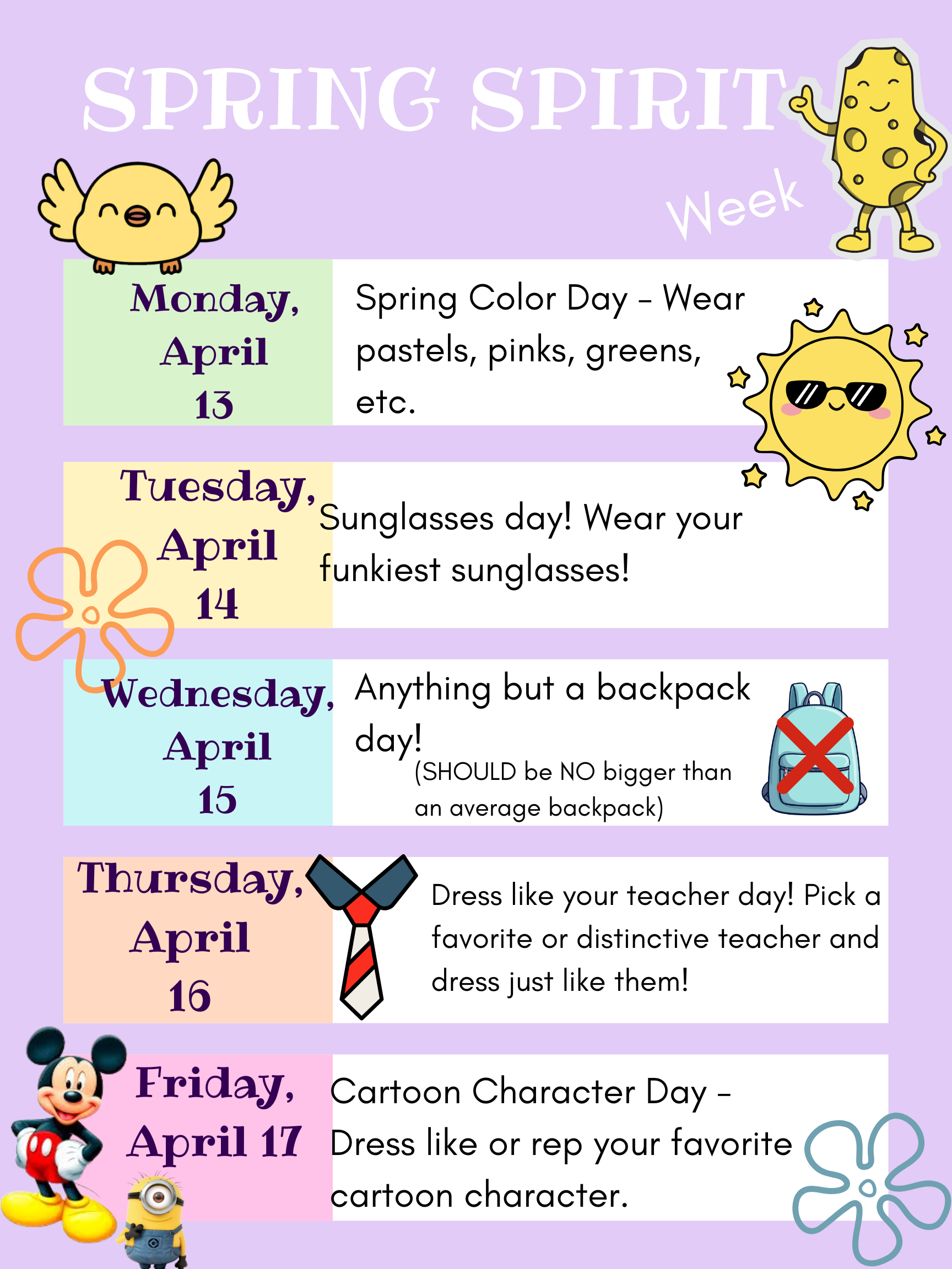 - Monday, April 13 – Spring Color Day: Wear your favorite spring colors like pastels, pinks, and greens.