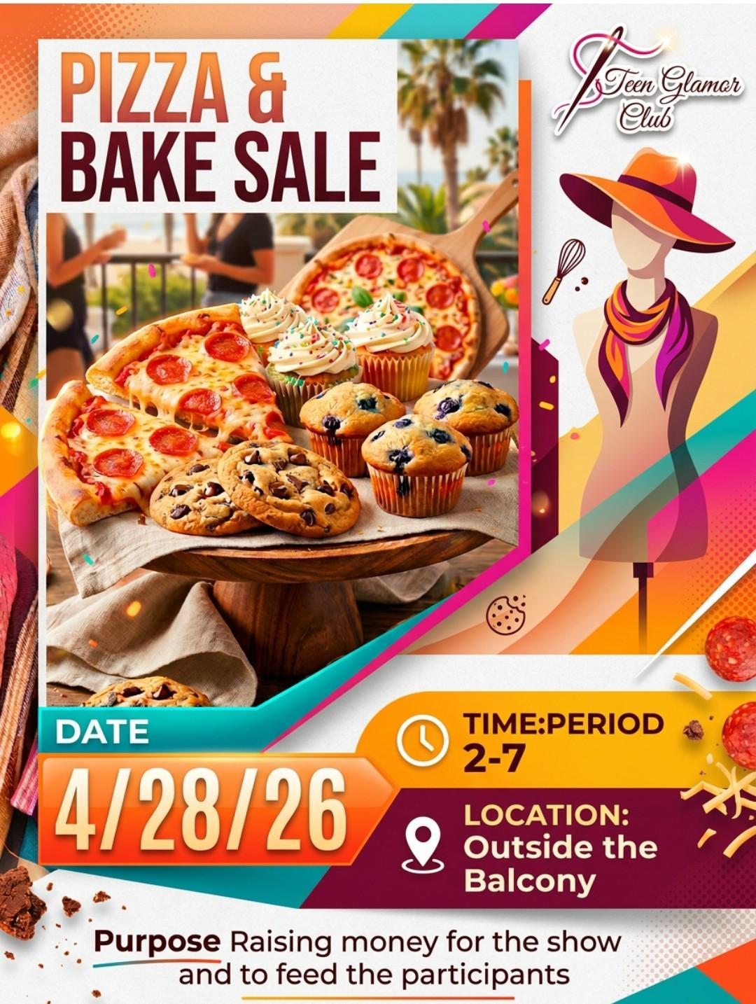 The Teen Glamour Club is hosting a Pizza & Bake Sale on Monday, April 28, 2026, from 2:00 to 7:00 PM, located outside the balcony.